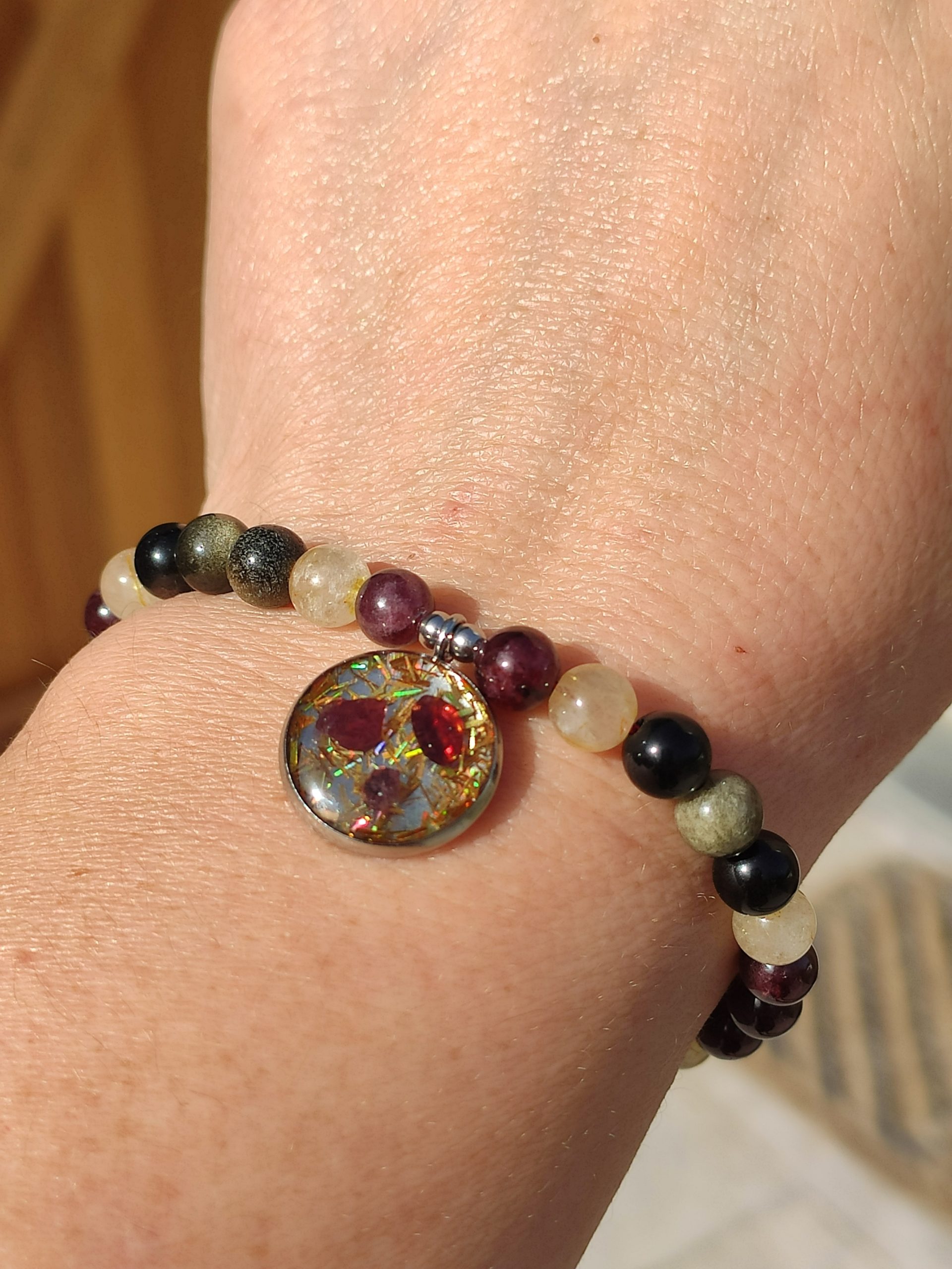 Bracelet en Quartz rutilé (jaune), Obsidienne dorée (noire) et Grenat (rouge).
