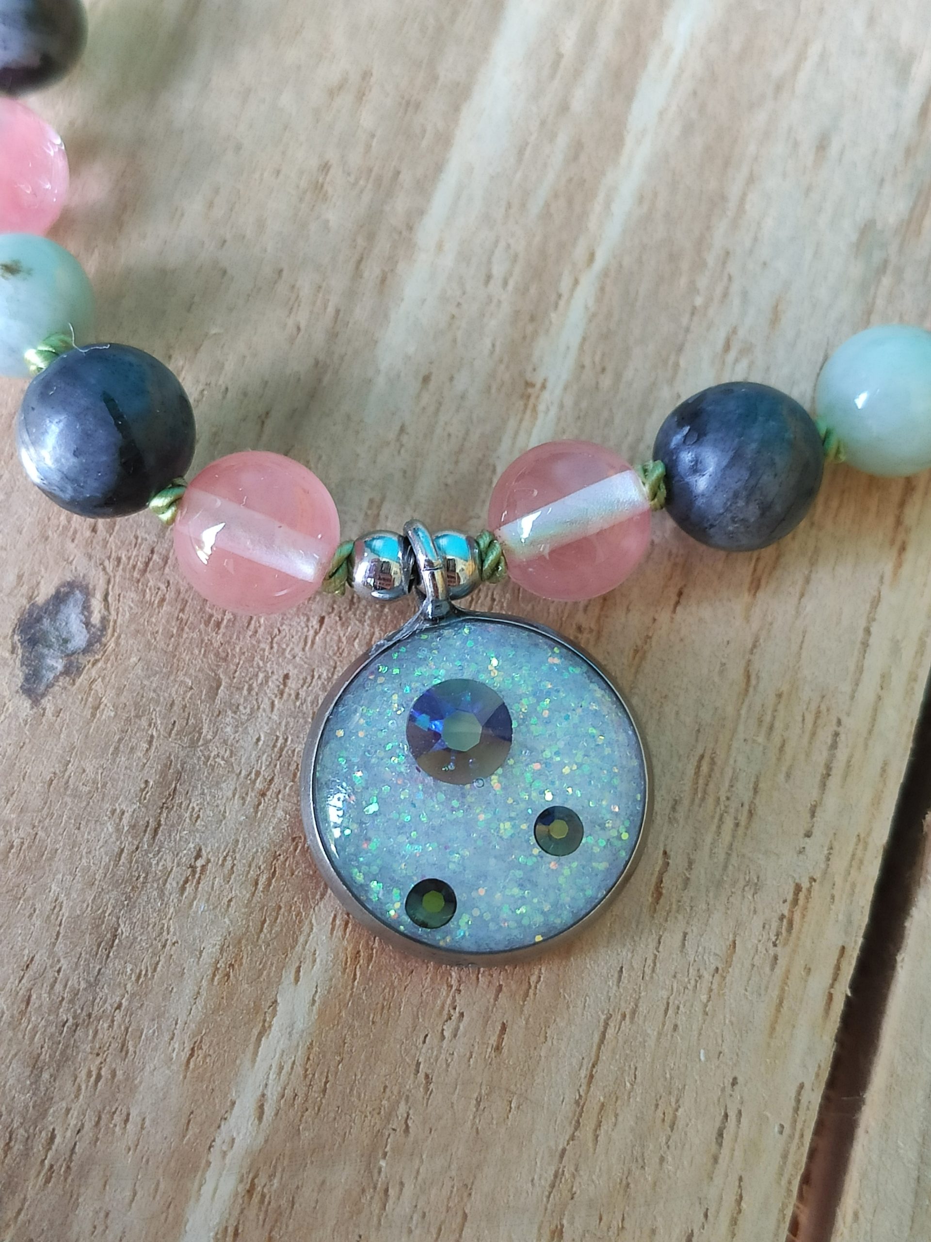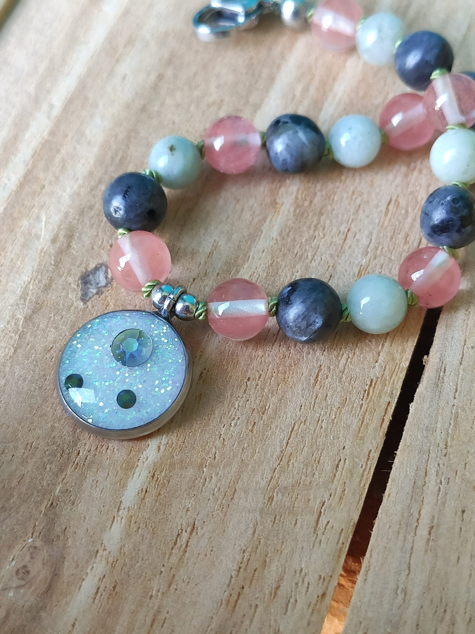 Bracelet en Quartz Fraise (rose), Jade de Birmanie (verte) et Larvikite (gris bleutée).