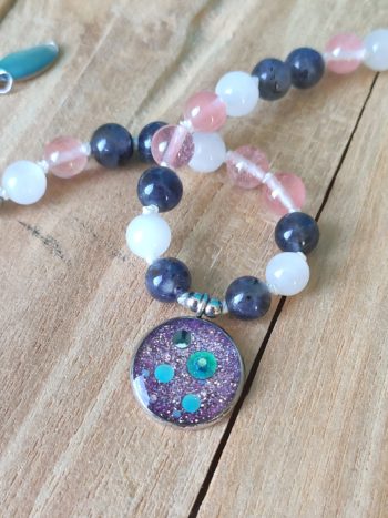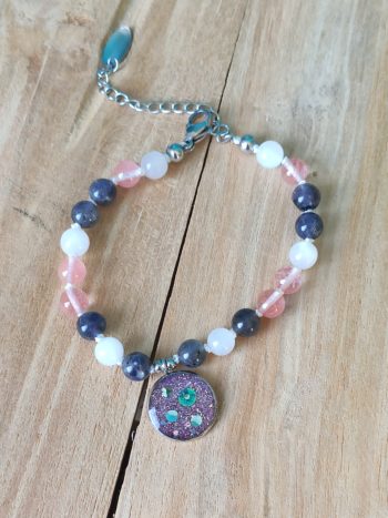 Bracelet en Quartz Fraise (rose), Labradorite Blanche (blanc), Iolite (gris/violet).