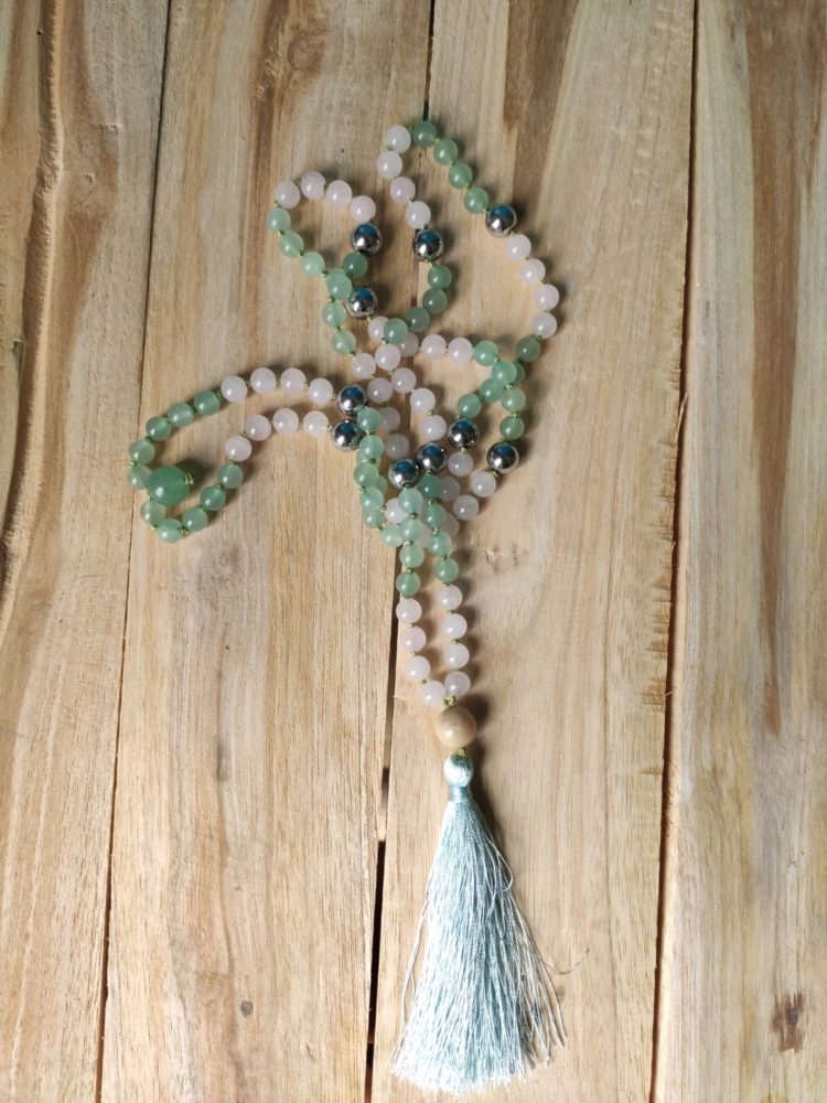 Mala de 108 perles composés de Quartz Rose (rose), Aventurine (verte) et d’Hématite (argent).