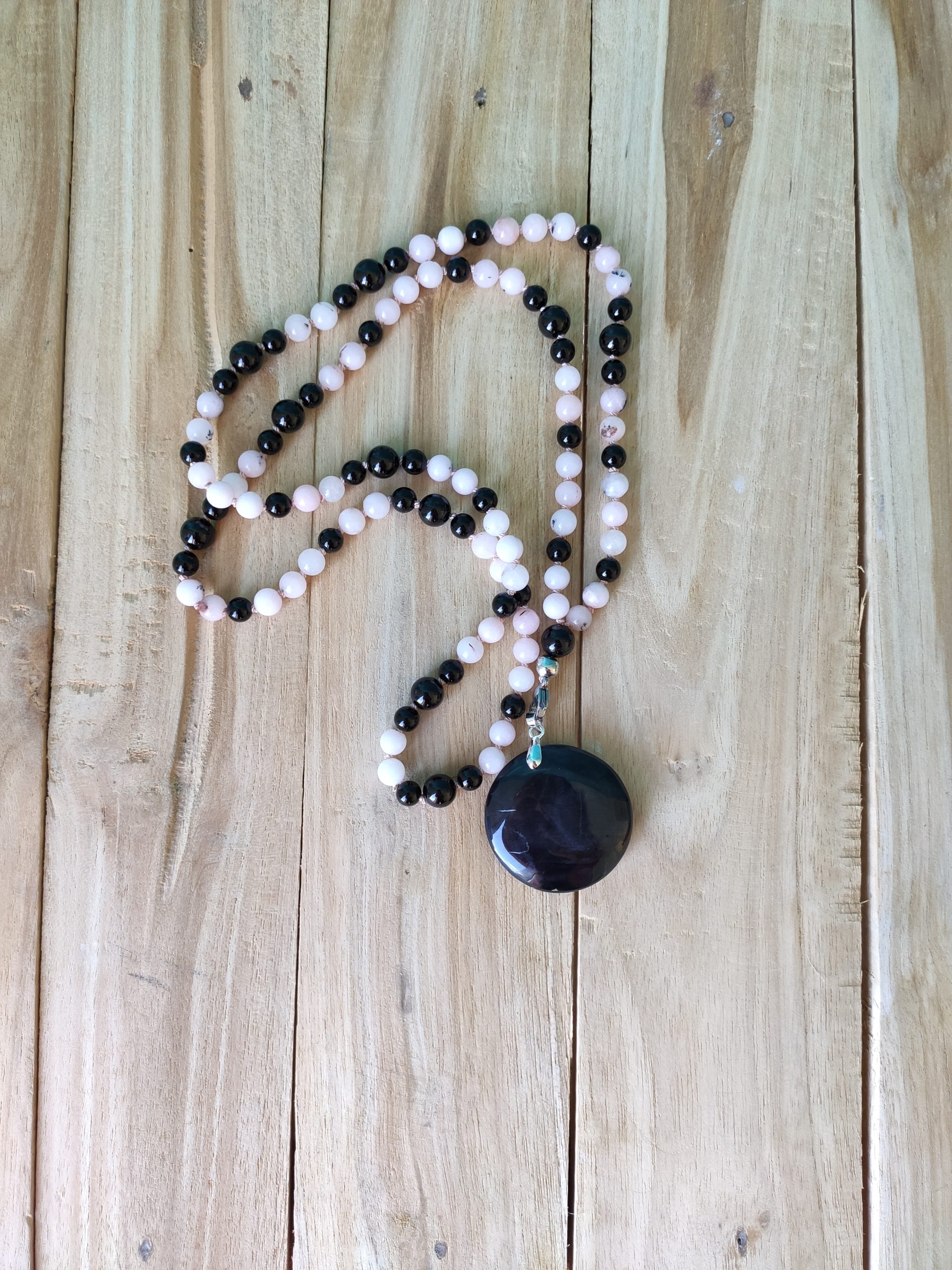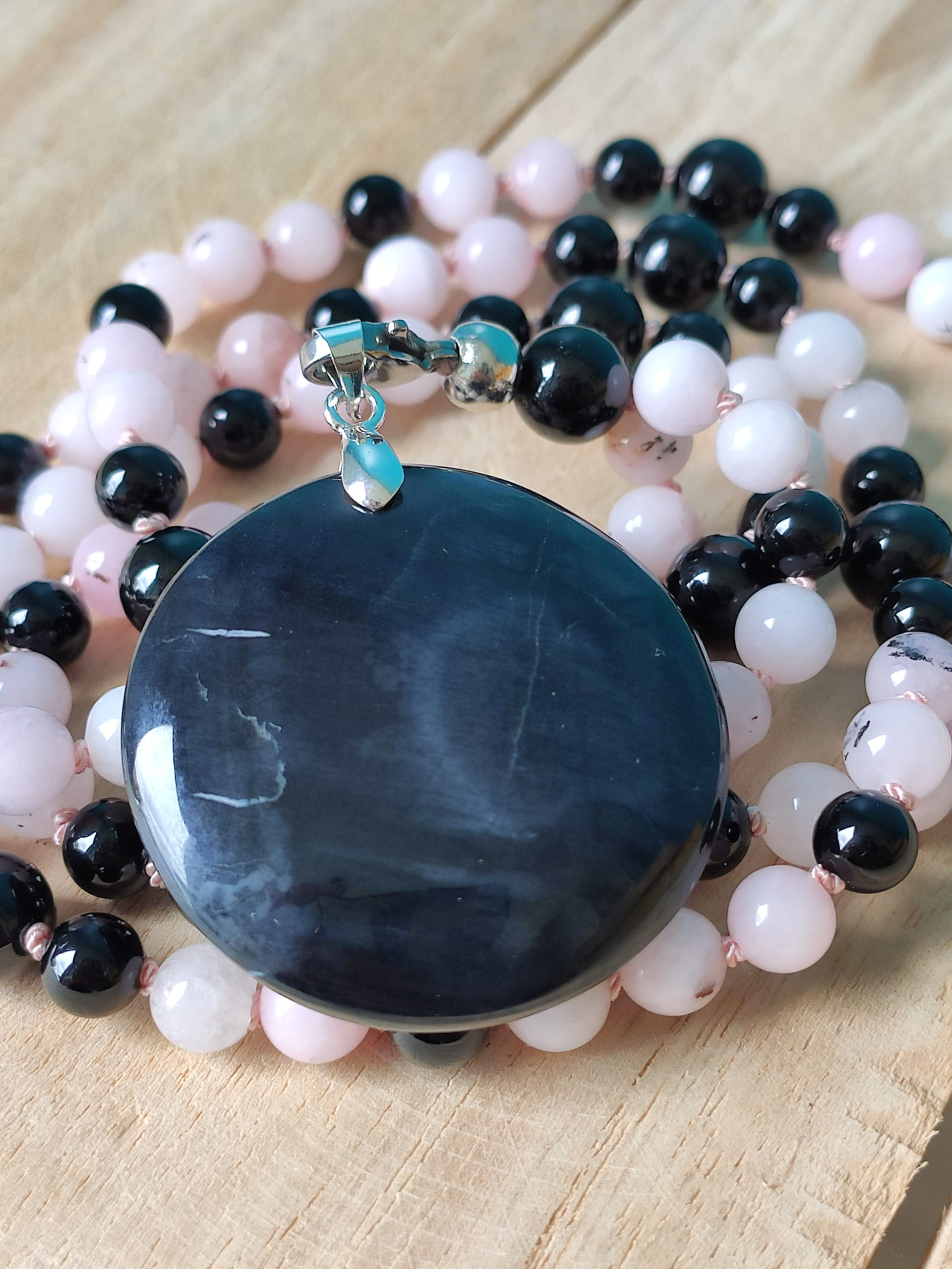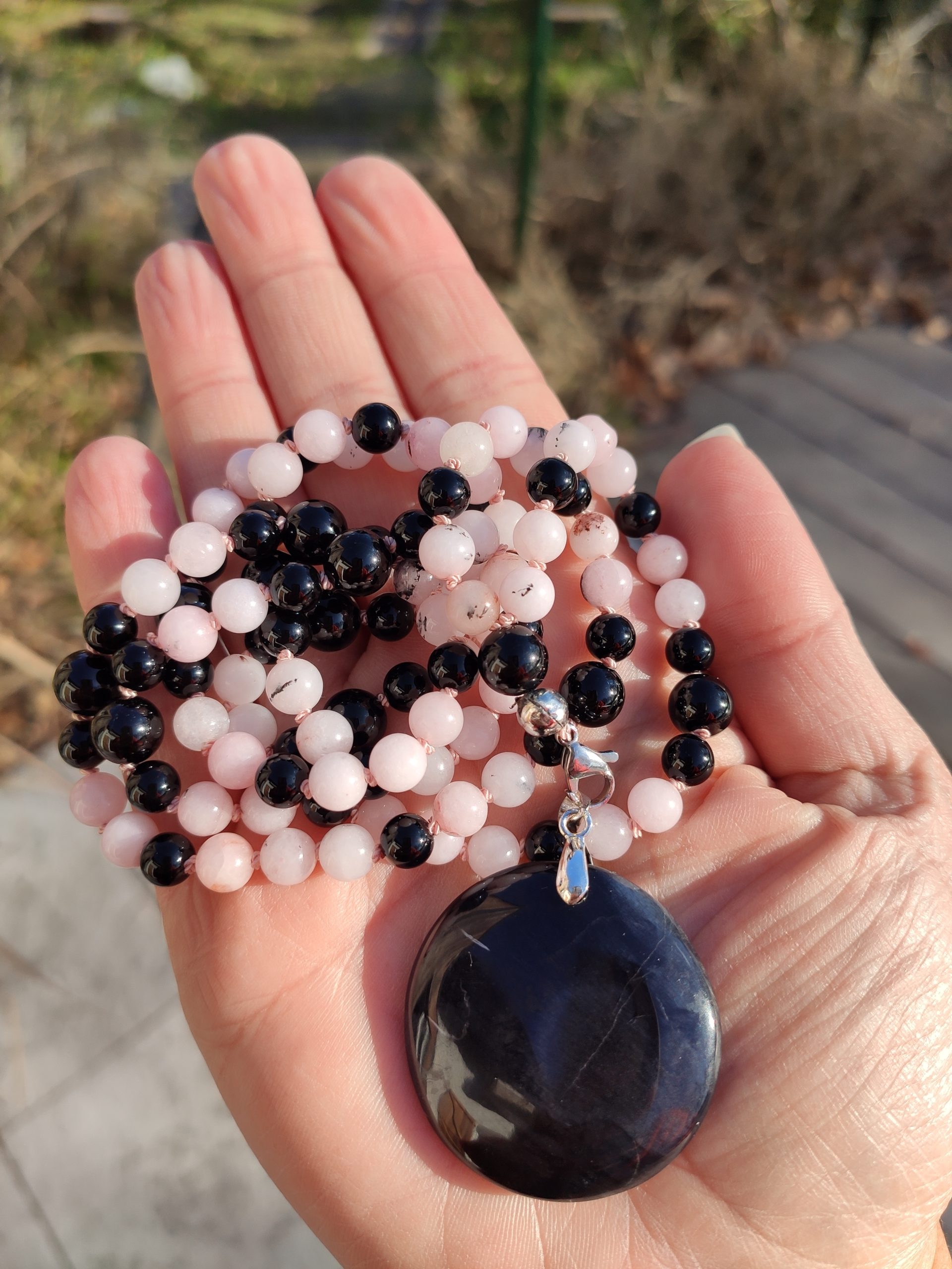 Mala de 108 perles en Jaspe Fleur de Cerisier (rose), de Tourmaline noire et pendentif en Tourmaline Noire.