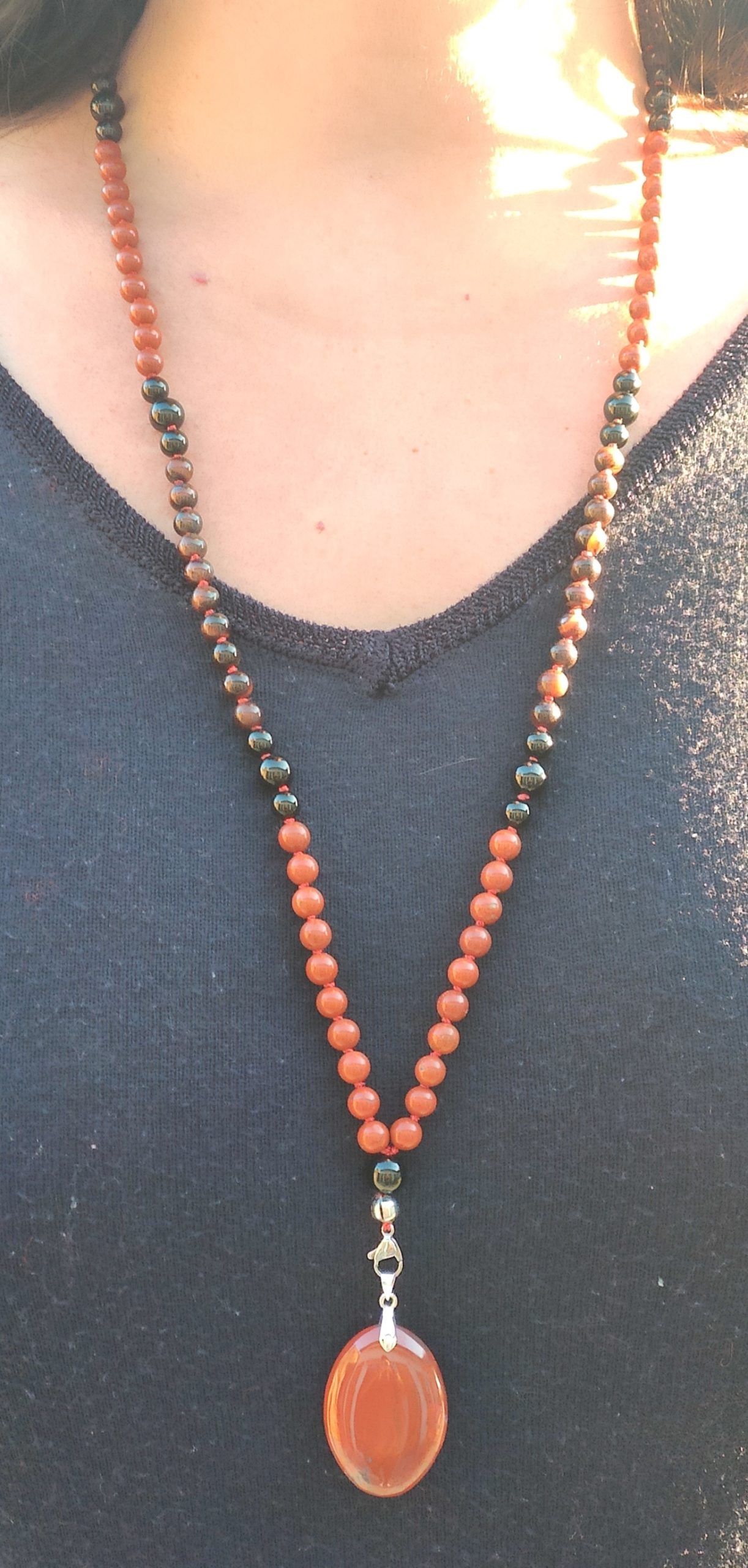 Mala de 108 perles en Œil de Taureau (rouge), Jaspe Rouge (rouge), Tourmaline Noire (noire) et pendentif en Jaspe rouge.