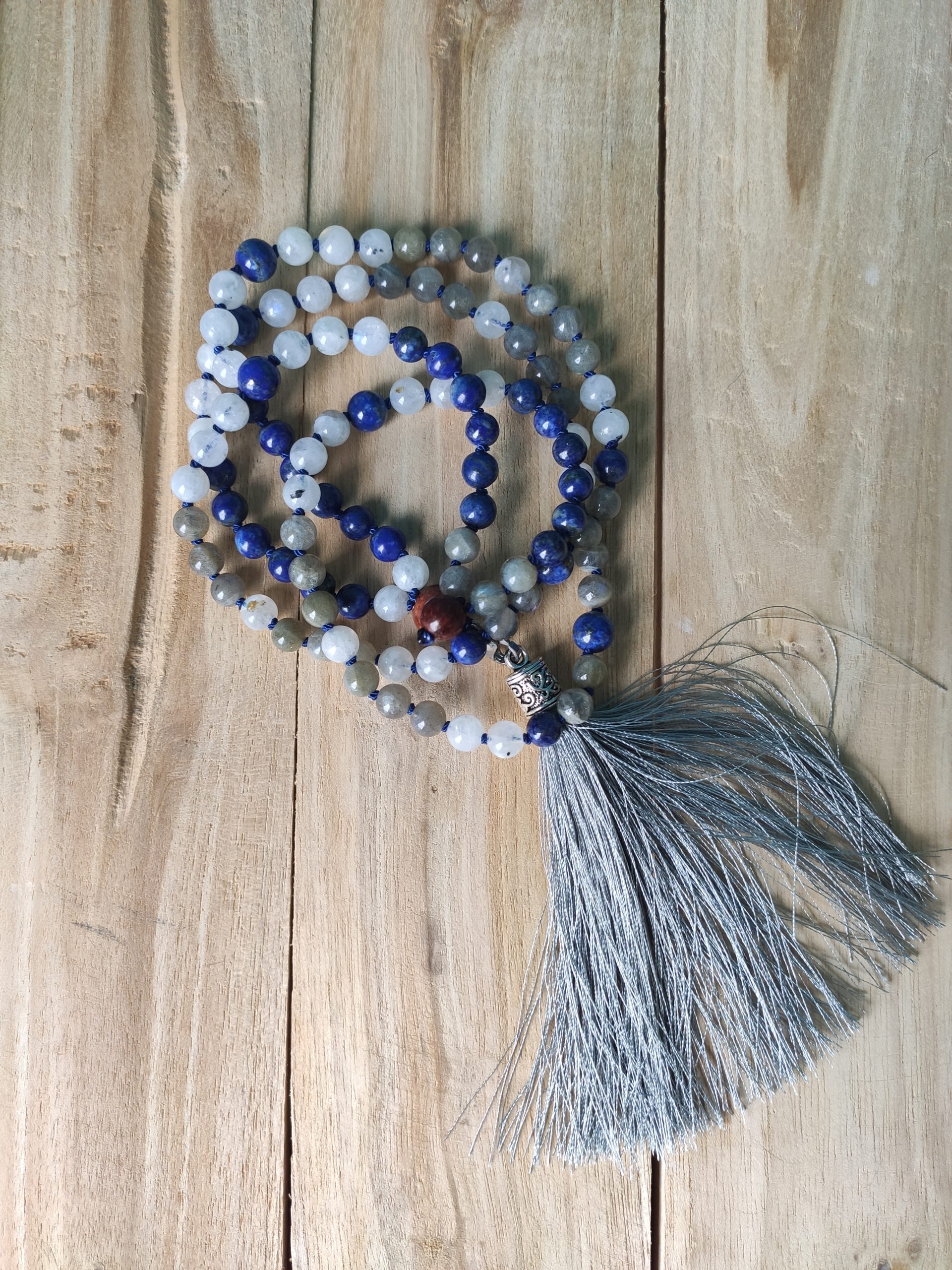Mala de 108 perles en Labradorite (gris bleuté), Lapis-lazulis (bleue), Péristérite (blanche) et perles gurus en bois de cocotier.