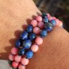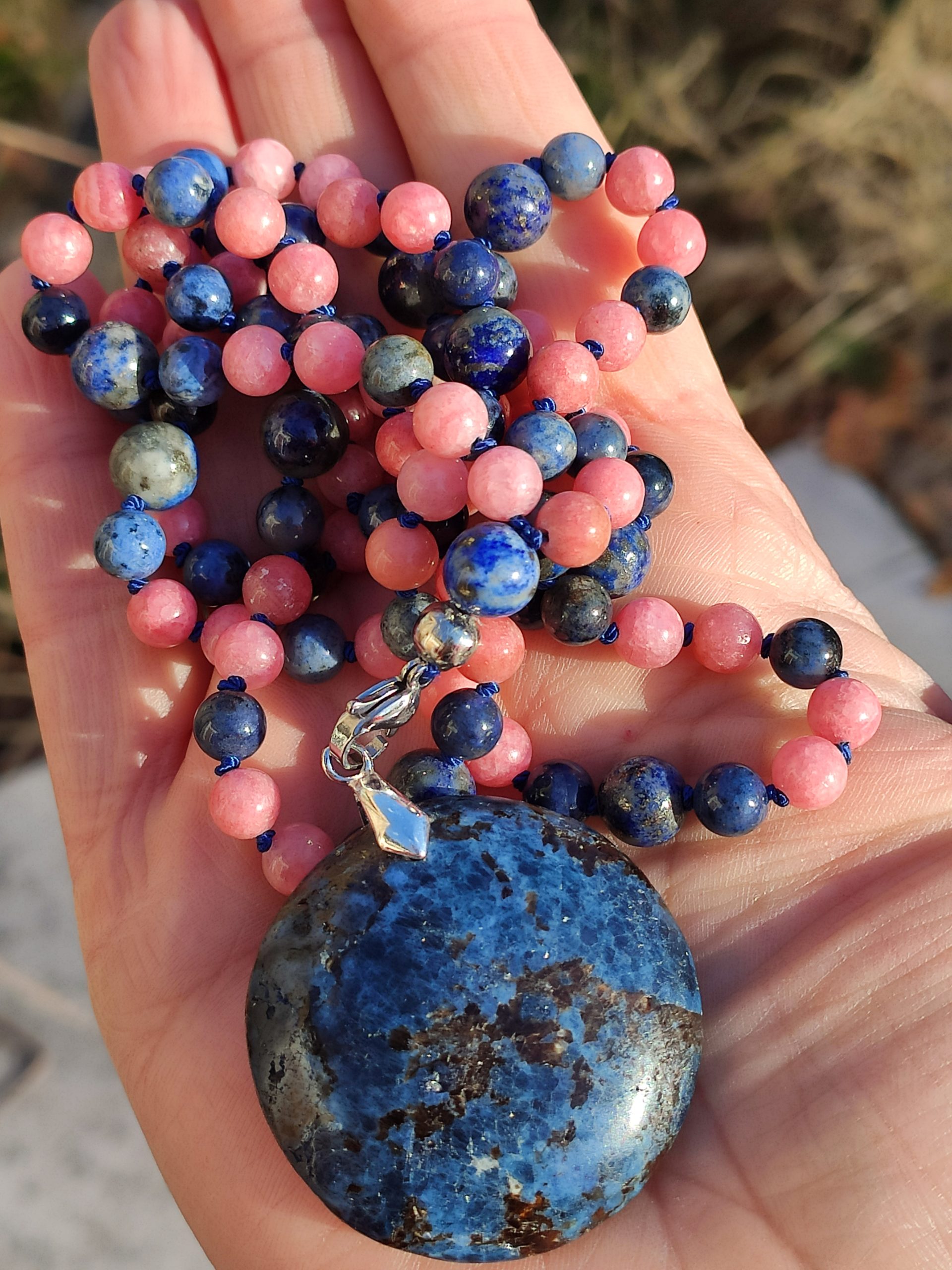 Mala de 108 perles en Rhodochrosite (rose), de Dumortiérite (bleue), de Lapis-Lazuli (Bleue 8mm) et pendentif en Dumortiérite.