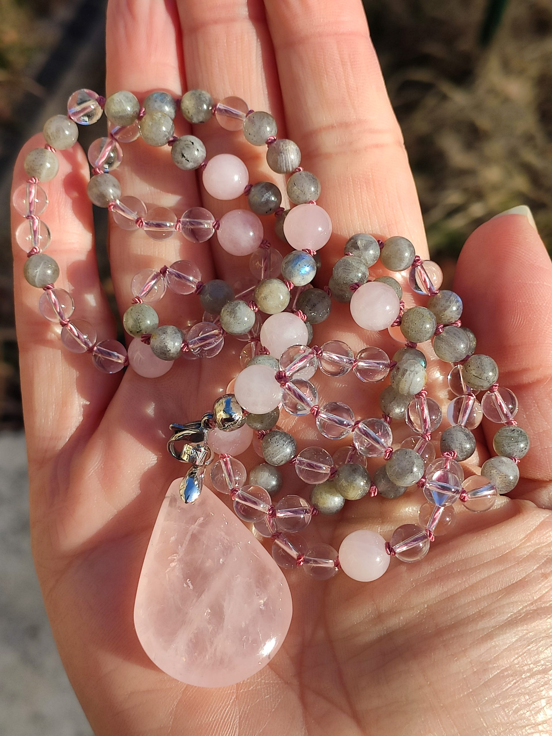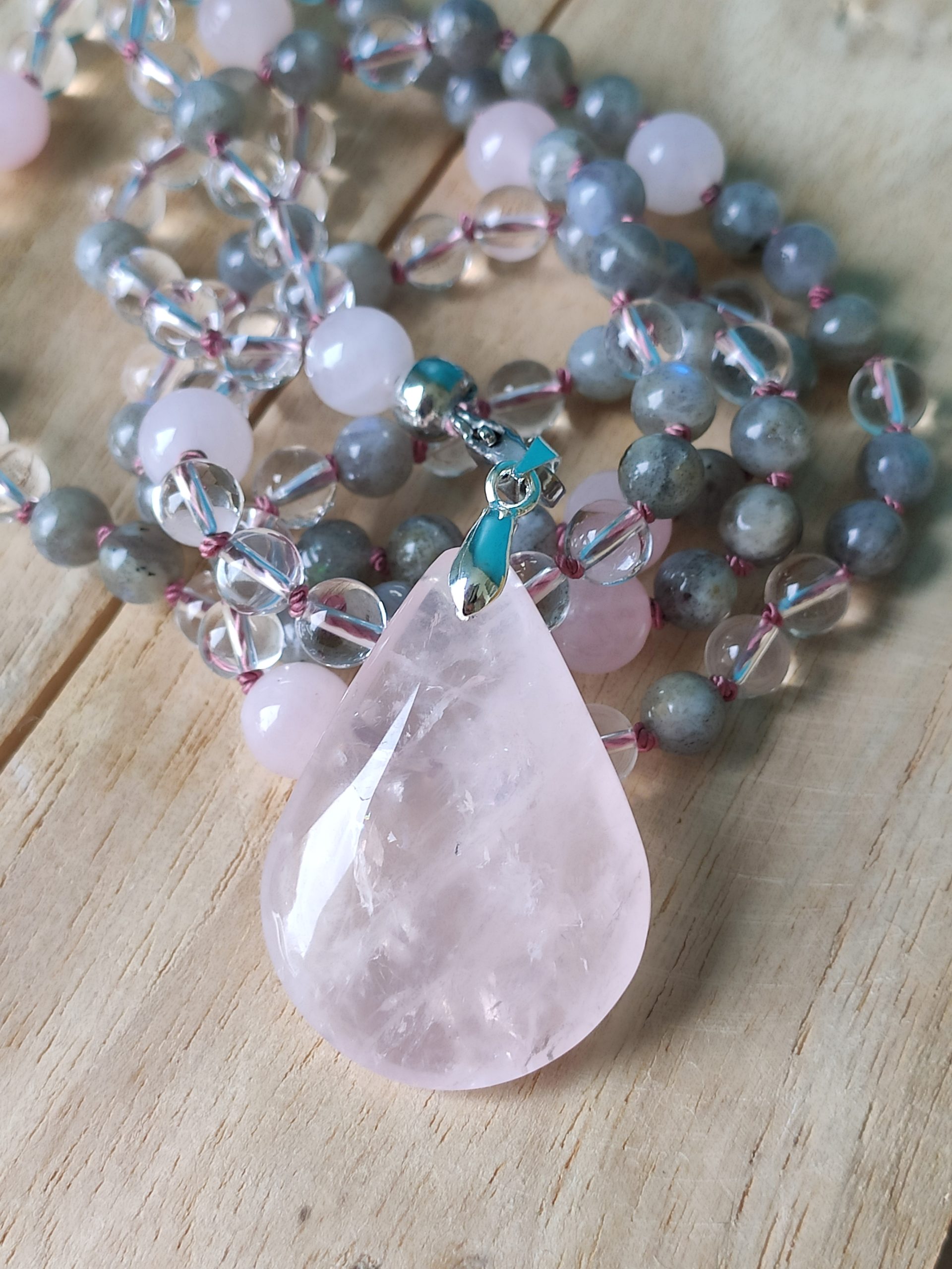Mala de 108 perles en labradorite (grise), cristal de roche (transparente), de quartz rose (rose) et pendentif en Quartz Rose.