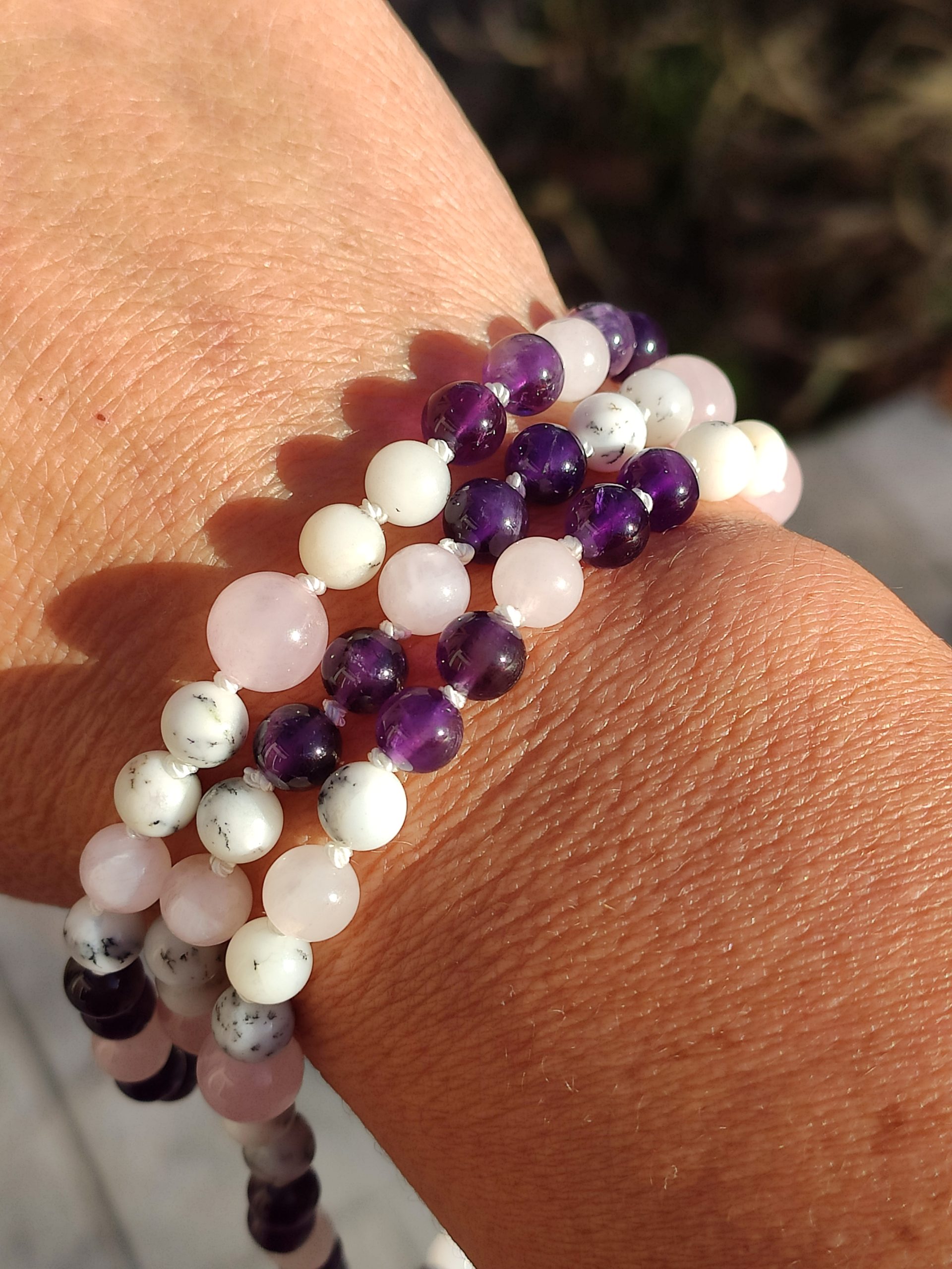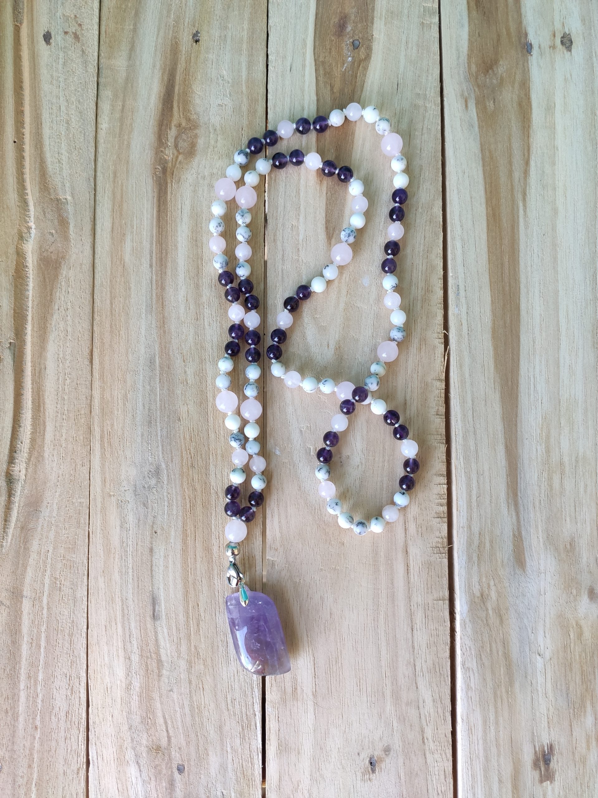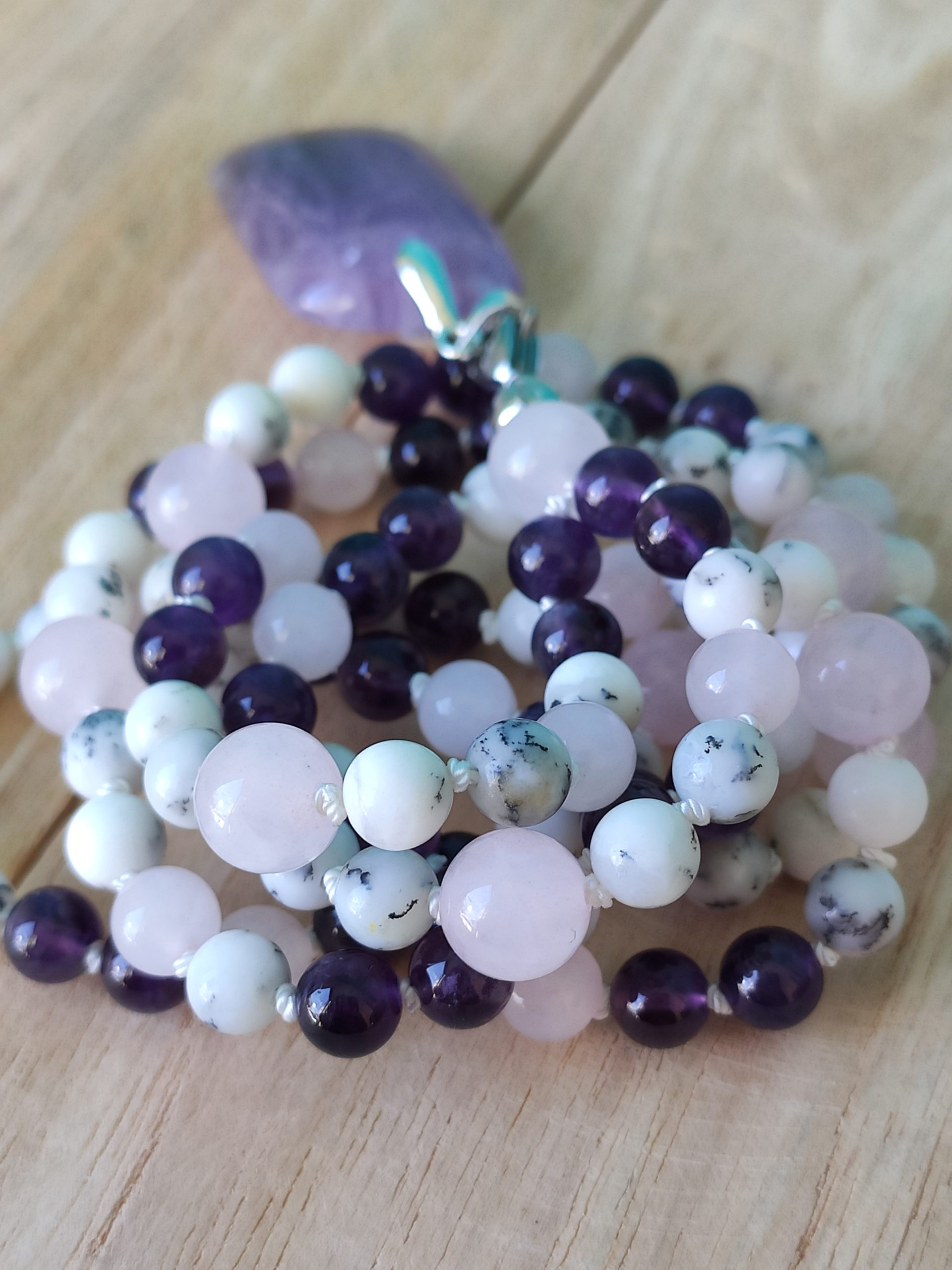 Mala de 108 perles en Quartz rose, d’Améthyste (violette), d’Opale dendritique (blanche) et pendentif en Améthyste.